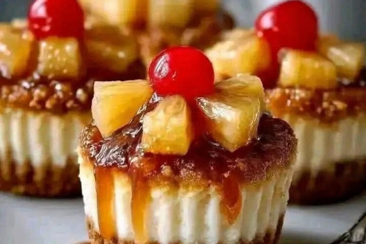 Mini Pineapple Cheesecakes are adorable, individual-sized desserts that flip the script on traditional cheesecake by featuring a caramelized pineapple topping revealed upside-down, nestled over a creamy vanilla filling and buttery graham cracker crust—all baked in muffin liners for easy, portion-perfect serving. This clever recipe delivers the tropical brightness of pineapple with brown sugar glaze, optional maraschino cherry accent for retro charm, and smooth cream cheese tang balanced by vanilla, creating bite-sized treats that are as fun to unmold and present as they are to eat. Ideal for summer parties, holidays, brunches, or anytime you want impressive yet simple sweets, these minis bake quickly at 325°F for 15-18 minutes, chill to set, and yield 8 indulgent portions at around 210 calories each. The provided directions ensure even baking and easy release with sprayed liners. In this comprehensive guide, we’ll explore their origins as tropical cheesecake cups, cultural appeal in portable desserts, precise ingredients, variations, success tips, detailed instructions, sensory delight, nutrition, and lighter options—highlighting why Mini Pineapple Cheesecakes are a charming, flip-worthy favorite.