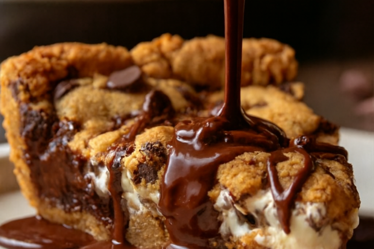 Originating from modern home baking trends, this gooey marvel has gained popularity through food blogs and social media, where bakers seek to reinvent classic recipes into show-stopping treats. It’s particularly beloved during cooler months when the oven’s heat fills the kitchen with irresistible aromas of vanilla, chocolate, and caramelizing sugar. Served warm with a scoop of vanilla ice cream, it becomes an unforgettable finale to any meal, offering layers of texture from chewy dough to melty chocolate and fluffy marshmallows. Whether you’re a seasoned baker or a novice, this recipe promises impressive results with minimal effort, making it a go-to for potlucks, family dinners, or cozy nights in. In a world of complicated desserts, the Gooey Chocolate Chip Cookie Pie stands out for its simplicity and over-the-top deliciousness.