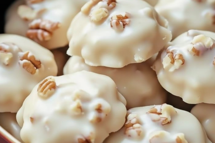 Biting into one reveals a smooth, velvety interior from the white chocolate and marshmallow creme, enveloping chopped pecans for textural contrast—creamy yet substantial. Flavor is predominantly sweet vanilla with buttery undertones, milder than traditional caramel pralines, allowing the pecans’ earthy richness to shine through.