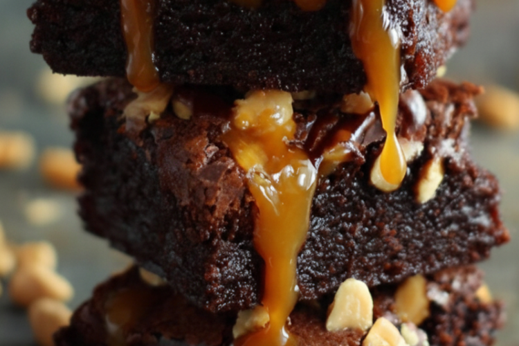 Cooled, they set firm yet yielding. Slices reveal cross-section magic—fudgy dark brownie framing molten caramel pockets, peanut studs, Snickers chunks. Optional drizzles glisten atop.