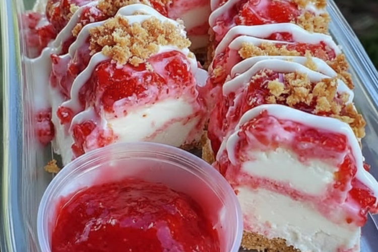 Strawberry Crunch Cheesecake Chunks are a delightful fusion of creamy cheesecake, tangy strawberry layers, and a nostalgic crunchy topping reminiscent of classic strawberry shortcake ice cream bars. These portable, bite-sized or bar-style treats feature a buttery graham cracker crust, silky vanilla cheesecake filling, vibrant strawberry sauce, and a signature crumble made from crushed vanilla cookies blended with freeze-dried strawberry powder. Optional white chocolate drizzle adds extra decadence, while fresh strawberries provide a bright garnish. Perfect for parties, potlucks, or summer gatherings, they offer the indulgence of cheesecake without the fuss of a full cake.