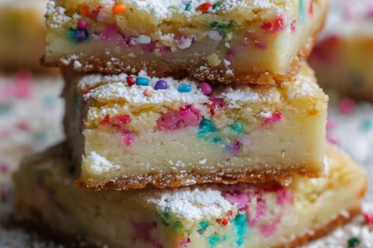 Cake Batter Gooey Bars are a playful, indulgent treat that tastes like biting into raw funfetti cake batter—only fully baked, ultra-gooey, and safe to devour. A buttery yellow cake mix crust forms the sturdy base, topped with a thick, creamy layer of sweetened cream cheese studded with rainbow sprinkles that burst with color and nostalgic birthday cake flavor. The bars bake to golden edges with a signature soft, jiggly center, finished with a snowy dusting of powdered sugar and extra sprinkles for celebratory sparkle.