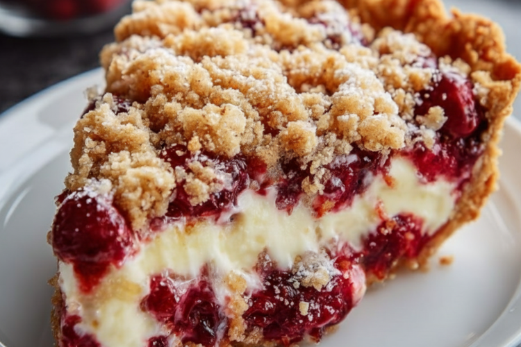 Cranberry Cream Cheese Crumb Pie masterfully layers textures and flavors—creamy elegance meeting tart fruit and crunchy topping in holiday harmony.