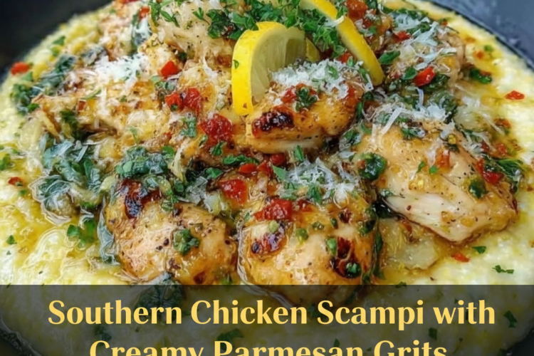 Southern Chicken Scampi with Creamy Parmesan Grits is a soul-satisfying fusion dish that marries the bright, garlicky-lemony flavors of Italian-American shrimp scampi with tender chicken and the ultimate Southern comfort: rich, cheesy stone-ground grits. Thinly sliced chicken breasts bathe in a buttery olive oil sauce infused with garlic, shallots, red pepper flakes, white wine, and fresh lemon—creating a light yet deeply flavorful pan sauce. Served atop velvety Parmesan grits enriched with cream and butter, every bite delivers contrasting textures: juicy chicken, silky grits, and zesty brightness from parsley and lemon.