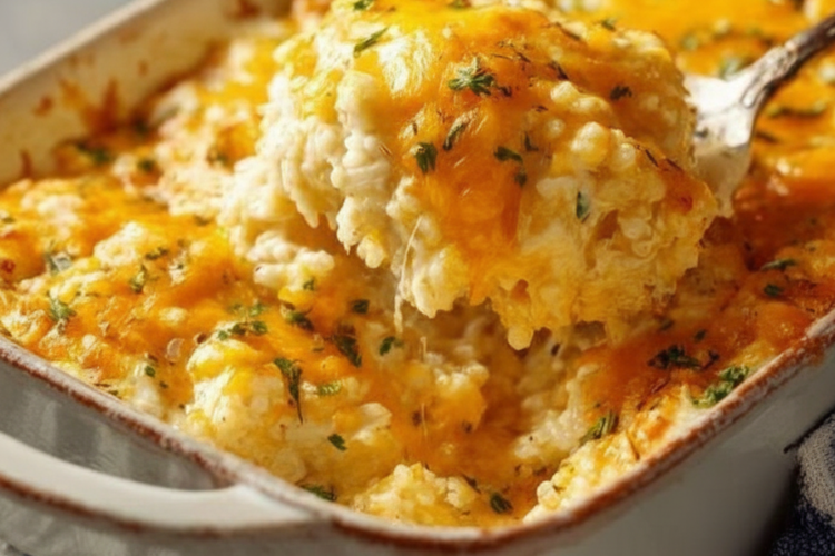 The 3-Ingredient Cheesy Rice Casserole is a visual and textural masterpiece: a golden-brown blanket of melted cheddar crowns a creamy, tender rice base that’s subtly savory from the soup. Fresh from the oven, it bubbles invitingly at the edges, with cheese stretching in gooey strands when scooped. The aroma is comforting—cheesy richness with hints of savory depth. Each bite offers fluffy rice grains coated in velvety sauce, punctuated by sharp cheddar bursts that balance creaminess with tang. It’s indulgent yet light, with a slight crust on top contrasting the soft interior.