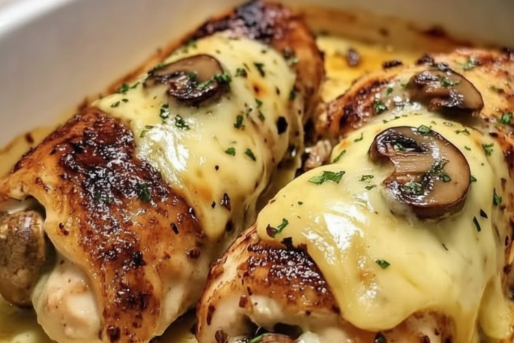 Cheesy Garlic Butter Mushroom Stuffed Chicken is a visual stunner: golden-baked breasts with subtle cheese peeking from seams, sliced to reveal rivers of molten mozzarella amid garlicky mushroom butter. The aroma is captivating—roasted garlic, earthy mushrooms, and buttery richness. Each bite contrasts crisp-tender chicken exterior with juicy interior, bursting into creamy, cheesy filling laced with savory mushroom bits and garlic punch.