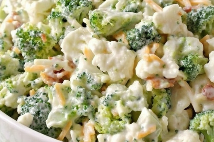 The Broccoli & Cauliflower Salad with Creamy Dressing stands as a timeless classic in American home cooking, blending crisp, fresh vegetables with rich, indulgent elements for a dish that perfectly balances health and satisfaction. This salad features raw broccoli and cauliflower florets tossed with crispy bacon, sharp cheddar cheese, and a tangy-sweet creamy dressing made from mayonnaise, sour cream, sugar, and salt. It delivers an irresistible combination of textures—crunchy veggies, creamy coating, smoky bacon bits, and melty cheese—that makes it addictive from the first bite. Often hailed as a potluck favorite or barbecue side dish, this salad has earned its place at family gatherings, church suppers, and holiday tables across the Midwest and beyond. What makes it truly special is its ability to feel both nourishing and decadent, showcasing how simple ingredients can create something extraordinarily flavorful. In this comprehensive guide, we’ll explore its origins, cultural role, precise ingredients, optional enhancements, expert tips, step-by-step instructions, sensory description, nutritional breakdown, and why it represents a delightful way to embrace healthful indulgence.