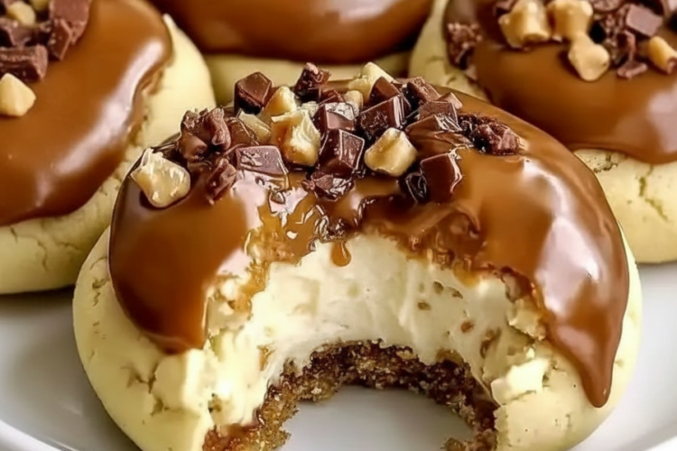 Caramel Cheesecake Cookies are plump, golden treats with crisp-chewy edges and ultra-soft centers hiding a creamy cheesecake surprise. The vanilla-scented dough yields to tangy-sweet filling, finished with glossy caramel rivers and crunchy toffee or candy bits for textural delight.