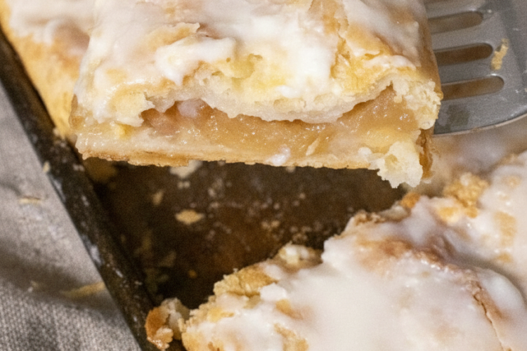 Imagine lifting a pan of golden pastry: the top crust flaky and crisp, glazed with a smooth white icing that crackles slightly under the knife, revealing a thin but generous layer of tender, cinnamon-scented apples nestled between buttery layers.