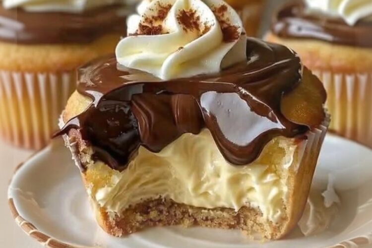 Picture a tray of glossy cupcakes, each topped with rich chocolate that glistens under the light. Guests bite into the soft cake, surprised by the creamy vanilla center. It’s a dessert that feels nostalgic yet modern, indulgent yet approachable — a true crowd‑pleaser.