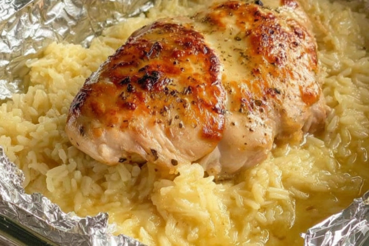 Amazing Forgotten Chicken emerges from the oven as a golden, bubbling masterpiece: tender chicken breasts crowned with crispy onion mix bits, sitting atop a bed of ultra-creamy, flavorful rice that gleams with rich sauce. The foil reveals steam-scented perfection—the chicken juicy and white, infused with savory depth, while the rice is fluffy yet lusciously coated.