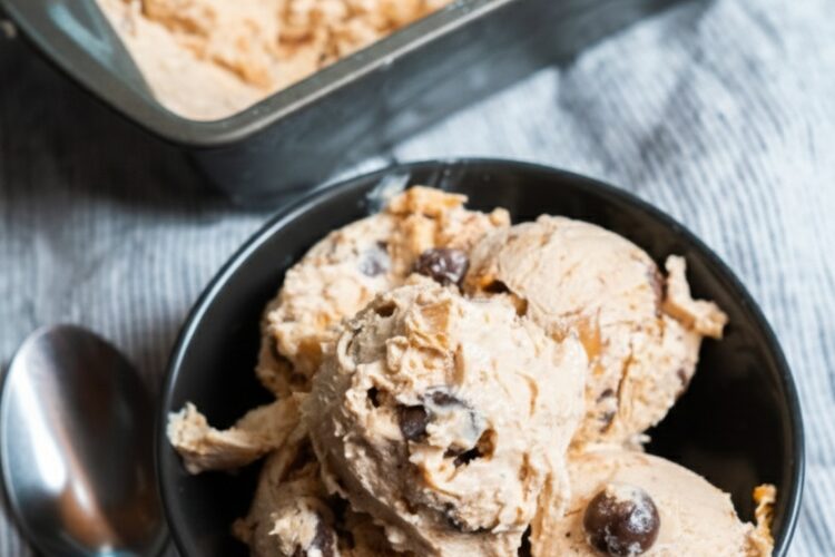 - Mix in chocolate chips and transfer to a dish or container for freezing. Swirl in additional peanut butter with a knife if desired.