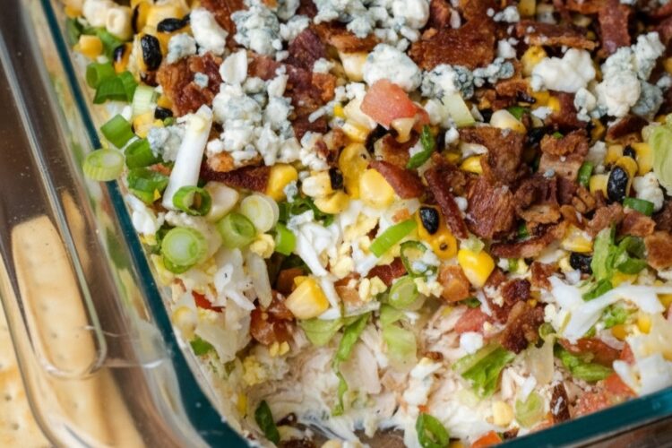 Perfect for game days, potlucks, summer barbecues, or any gathering where you want an appetizer that’s as gorgeous to look at as it is delicious to eat, this dip disappears fast. Served in a clear glass dish to showcase the colorful layers, it’s paired with sturdy tortilla chips, crackers, or veggie sticks for the ultimate bite that captures the essence of a Cobb salad in every scoop.