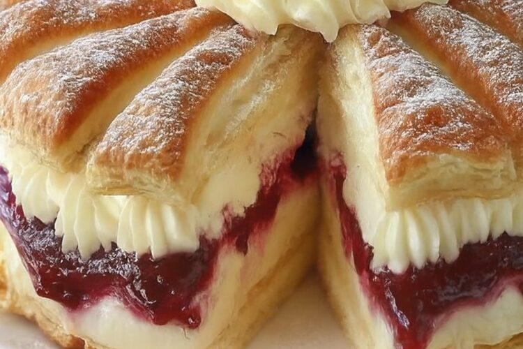 This Puff Pastry Cream and Jam Cake is a showstopper dessert that combines flaky, golden puff pastry with a rich, creamy filling and a sweet layer of jam. Topped with fresh berries and a dollop of whipped cream, it’s a decadent treat that’s perfect for special occasions, afternoon tea, or any time you want to impress your guests. The crispy pastry contrasts beautifully with the smooth cream and tangy jam, making each bite heavenly.