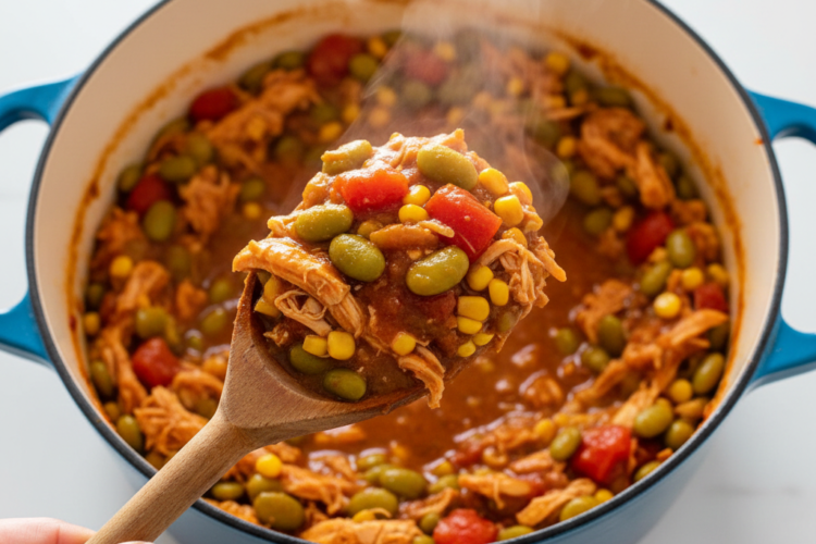 5. Add the meats: Fold in the pulled pork and chopped cooked chicken. Stir gently to distribute everything evenly. The stew should be thick but not dry; add a splash more broth if it looks too dense.