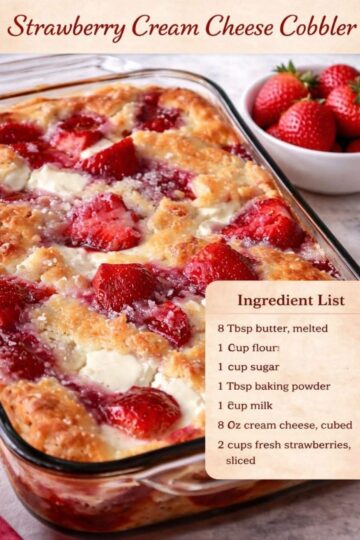 🍓 Strawberry Cream Cheese Cobbler 🍓 🌸 Introduction Strawberry Cream Cheese Cobbler is the kind of dessert that feels like a warm hug. Juicy strawberries bubble beneath a soft, buttery topping while pockets of rich, creamy cream cheese melt into every bite. This dessert is simple enough for a weeknight treat, yet elegant enough for […]