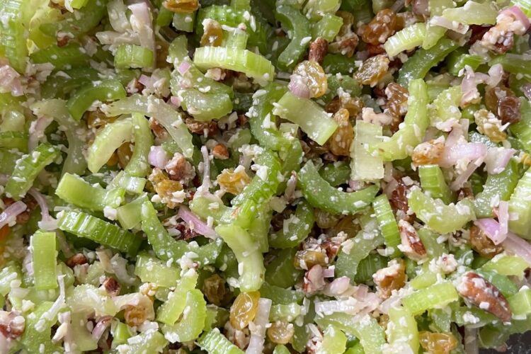 Thinly sliced celery provides the base, while nuts, raisins, cheese, and a zesty dressing add layers of flavor and texture.