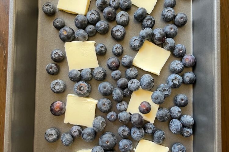 Pour batter into the hot pan immediately. Scatter blueberries evenly across the batter.