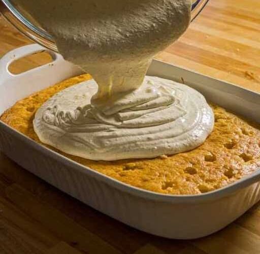 Once baked, holes are poked across the cake, and a liquid or creamy mixture is poured over the top. This allows the filling to seep inside, making the cake extra moist and flavorful.