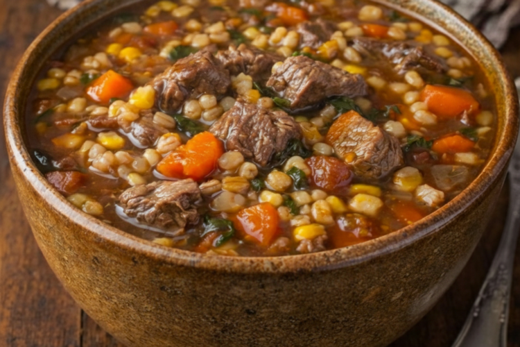 These ingredients create a balanced soup with tender meat, hearty grains, and flavorful vegetables.