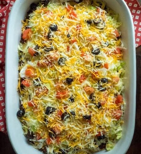 To make ahead, assemble the casserole (without lettuce and tomato), cover tightly, and refrigerate up to 24 hours before baking.