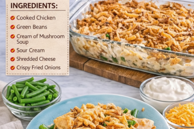 If you grew up loving classic green bean casserole during the holidays, this upgraded version will quickly become your new favorite weeknight dinner. It combines tender chicken, crisp-tender green beans, a rich creamy sauce, and a golden, cheesy topping baked to perfection. It’s hearty, satisfying, and incredibly easy to make.