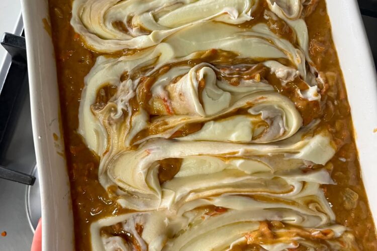 Do not fully mix it in. Instead, gently swirl it with a knife to create pockets of cream cheese throughout the cake.