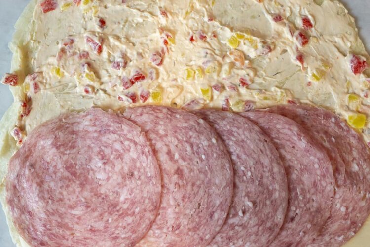 Next, layer slices of provolone cheese evenly over the spread. Follow with a layer of salami or soppressata.