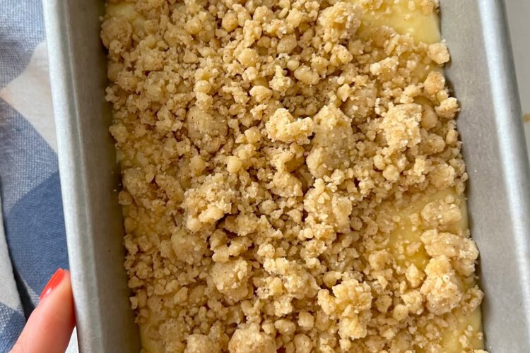 Pour the batter into the prepared loaf pan. Sprinkle the crumb topping evenly over the top.