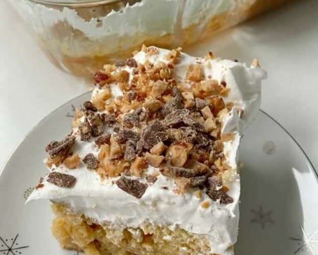 If you’re looking for a dessert that’s incredibly easy to make yet tastes like it came straight from a bakery, this Toffee Butterscotch Poke Cake is the answer. Moist, rich, and loaded with sweet butterscotch flavor, this cake is soaked with a luscious syrup mixture, topped with fluffy whipped topping, and finished with crunchy toffee bits and peanuts.